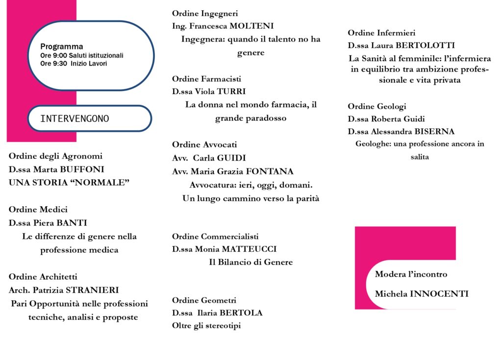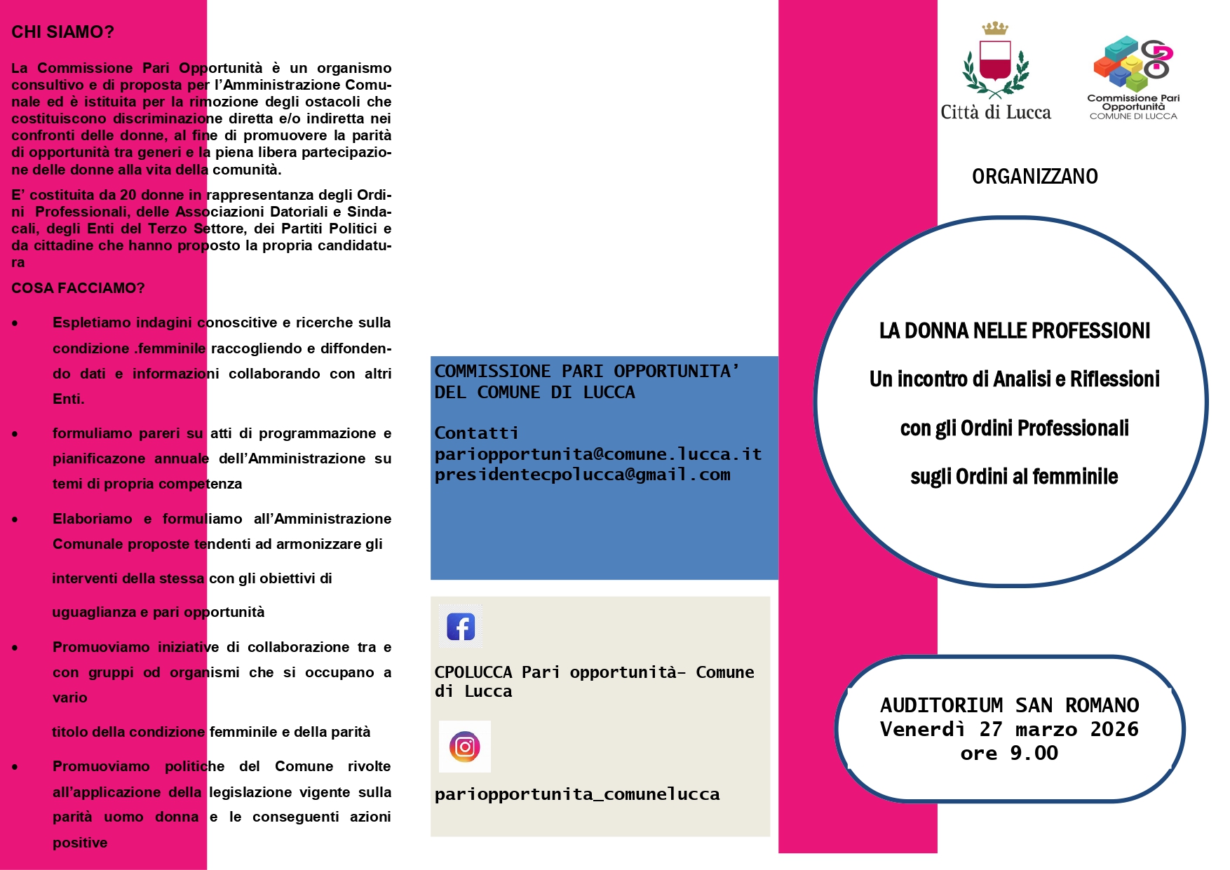 L’evento, al quale partecipa anche la Dott.ssa Marta Buffoni, presidente dell’ODAF PI-LU-MS, è stato organizzato dalla Commissione delle Pari Opportunità del Comune di Lucca, un organismo consultivo e di proposta per l’Amministrazione Comunale. La Commissione è stata istituita per la rimozione degli ostacoli che costituiscono discriminazione diretta e/o indiretta nei confronti delle donne, al fine di promuovere la parità di opportunità tra generi e la piena libera partecipazione delle donne alla vita della comunità. La Commissione suddetta è costituita da 20 donne in rappresentanza degli Ordini Professionali, delle Associazioni Datoriali e Sindacali, degli Enti del Terzo Settore, dei Partiti Politici e da cittadine che hanno proposto la propria candidatura.
